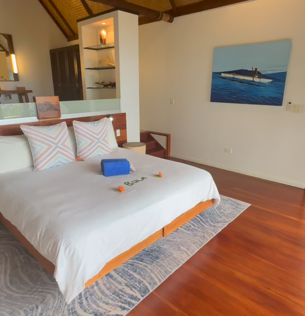 We flew into Nadi Airport, then hopped on a smaller plane to the other side of the island. From there, we took a boat to the resort, about a 30-minute ride across the most beautiful water. As we got closer, you could see the lush greenery, the villas tucked into the hillside, and that deep, vibrant blue water surrounding everything.